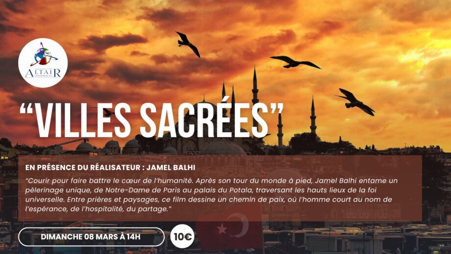 "Les Villes Sacrées" En présence du réalisateur : Jamel Balhi “Courir pour faire battre le cœur de l’humanité. Après son tour du monde à pied, Jamel Balhi entame un pèlerinage unique, de Notre-Dame de Paris au palais du Potala, traversant les hauts lieux de la foi universelle. Entre prières et paysages, ce film dessine un chemin de paix, où l’homme court au nom de l’espérance, de l’hospitalité, du partage.” Tarif unique : 10€ #Cinebisca #Biscarrosse #AltairConférences