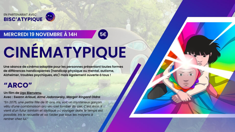 Une séance de cinéma adaptée pour les personnes présentant toutes formes de différences handicapantes (handicap physique ou mental. autisme, Alzheimer, troubles psychiques, etc) mais également ouverte à tous ! "ARCO" De Ugo Bienvenu, avec : Swann Arlaud, Alma Jodorowsky, Margot Ringard Oldra "En 2075, une petite fille de 10 ans, Iris, voit un mystérieux garçon vêtu d'une combinaison arc-en-ciel tomber du ciel. C'est Arco. Il vient d'un futur lointain et idyllique où voyager dans le temps est possible. Iris le recueille et va l'aider par tous les moyens à rentrer chez lui." TARIF UNIQUE : 5 EUROS #Cinebisca #Biscarrosse