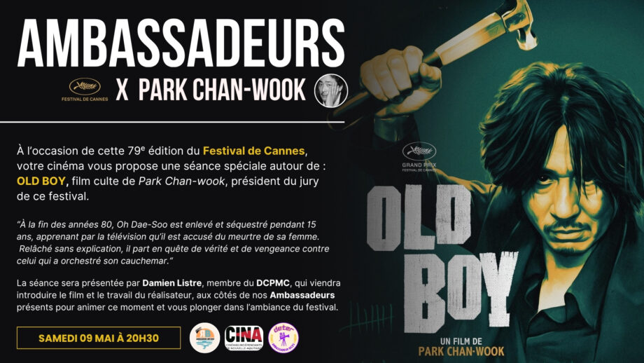 Ambassadeurs X Park Chan-Wook À l’occasion de cette 79ᵉ édition du Festival de Cannes, votre cinéma vous propose une séance spéciale autour de : OLD BOY, film culte de Park Chan-wook, président du jury de ce festival. “À la fin des années 80, Oh Dae-Soo est enlevé et séquestré pendant 15 ans, apprenant par la télévision qu’il est accusé du meurtre de sa femme. Relâché sans explication, il part en quête de vérité et de vengeance contre celui qui a orchestré son cauchemar.“ La séance sera présentée par Damien Listre, membre du DCPMC, qui viendra introduire le film et le travail du réalisateur, aux côtés de nos Ambassadeurs présents pour animer ce moment et vous plonger dans l’ambiance du festival. Evénement en partenariat avec DETER et CINA. #FestivaldeCannes #OldBoy #Cinebisca #Biscarrosse