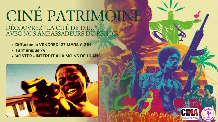 Ciné Patrimoine avec les Ambassadeurs du Renoir "La Cité de Dieu" (-16 ans) Un film de Fernando Meirelles "Dans une favela qui a vu le jour à Rio de Janeiro dans les années soixante, Fusée est un gamin noir, pauvre, trop fragile pour devenir hors-la-loi, mais assez malin pour ne pas se contenter d'un travail sous payé. Il grandit dans un environnement violent, mais tente de voir la réalité autrement, avec l'oeil d'un artiste. Il rêve de devenir photographe professionnel. Petit Dé, un enfant de onze ans, emménage dans la Cité. Il souhaite pour sa part devenir le plus grand criminel de Rio et commence son apprentissage en rendant de menus services à la pègre locale. Il admire Tignasse et son gang, qui arraisonnent les camions et cambriolent à tout va. Tignasse donne à Petit Dé l'occasion de commettre un meurtre, le premier d'une longue série..." La projection sera suivie d'une discussion avec les Ambassadeurs du Renoir. TARIF UNIQUE : 7€ #Cinebisca #Biscarrosse #Cinéma