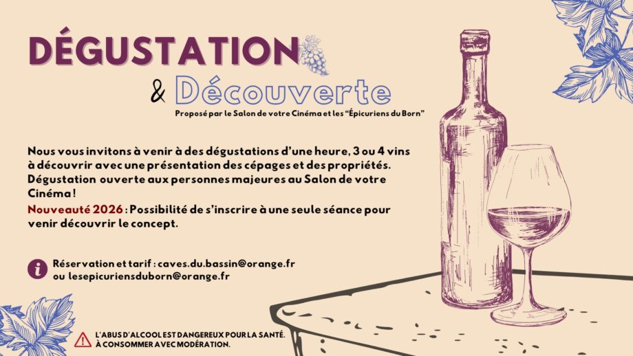Dégustation de vins par les Caves du Bassin Nous vous invitons à venir à des dégustations d’une heure, 3 ou 4 vins à découvrir avec une présentation des cépages et des propriétés. Dégustation ouverte aux personnes majeures au Salon de votre Cinéma ! Nouveauté 2026 : Possibilité de s’inscrire à une seule séance pour venir découvrir le concept. Réservation et tarif : caves.du.bassin@orange.fr ou lesepicuriensduborn@orange.fr L'abus d'alcool est dangereux pour la santé. A consommer avec modération.