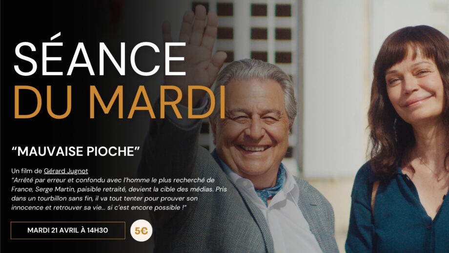La Séance du Mardi "MAUVAISE PIOCHE" Un film de Gérard Jugnot “Arrêté par erreur et confondu avec l’homme le plus recherché de France, Serge Martin, paisible retraité, devient la cible des médias. Pris dans un tourbillon sans fin, il va tout tenter pour prouver son innocence et retrouver sa vie... si c’est encore possible !“ TARIF UNIQUE : 5€