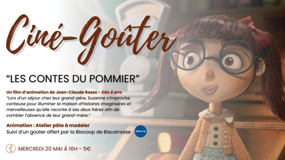 Le Ciné-Goûter des petits - Dès 6 ans Un film d’animation de Jean-Claude Rozec “Lors d’un séjour chez leur grand-père, Suzanne s’improvise conteuse pour illuminer la maison d’histoires imaginaires et merveilleuses qu’elle raconte à ses deux frères afin de combler l’absence de leur grand-mère.“ Animation : Atelier pâte à modeler Suivi d’un goûter offert par la Biocoop de Biscarrosse Tarif unique : 5€ #CineGoûter #Cinebisca #Biscarrosse