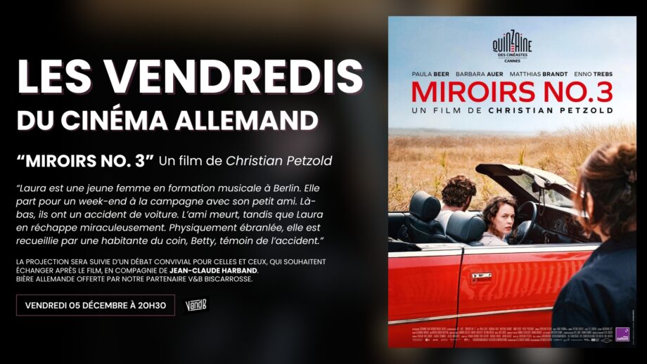 LES VENDREDI DU CINÉMA ALLEMAND "MIROIRS NO.3" Un film de Christian Petzold “Laura est une jeune femme en formation musicale à Berlin. Elle part pour un week-end à la campagne avec son petit ami. Là-bas, ils ont un accident de voiture. L’ami meurt, tandis que Laura en réchappe miraculeusement. Physiquement ébranlée, elle est recueillie par une habitante du coin, Betty, témoin de l’accident.” La projection sera suivie d’un débat convivial pour celles et ceux, qui souhaitent échanger après le film, en compagnie de Jean-Claude Harband. Bière allemande offerte par notre partenaire V&B Biscarrosse. #CinémaAllemand #Cinebisca #Biscarrosse