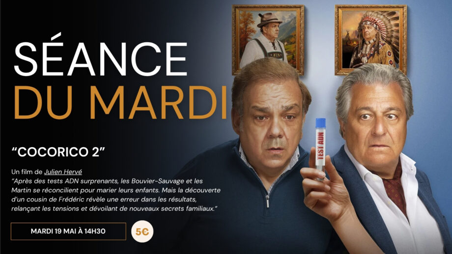 Diffusion spéciale Séance du Mardi "COCORICO 2" De Julien Hervé Avec : Christian Clavier, Didier Bourdon, Sylvie Testud "Après avoir découvert la vérité sur leurs origines, grâce à des tests ADN aux résultats pour le moins surprenants, les Bouvier-Sauvage et les Martin décident d’enterrer la hache de guerre, pour organiser le mariage de leurs enfants. Mais c’était sans compter sur un imprévu de taille : un cousin de Frédéric a été retrouvé grâce aux tests… Révélant que les résultats étaient erronés. Les deux familles vont découvrir que leurs ancêtres n’ont pas fini de les surprendre !" TARIF UNIQUE : 5€ #Séancedumardi #Cinebisca #Biscarrosse